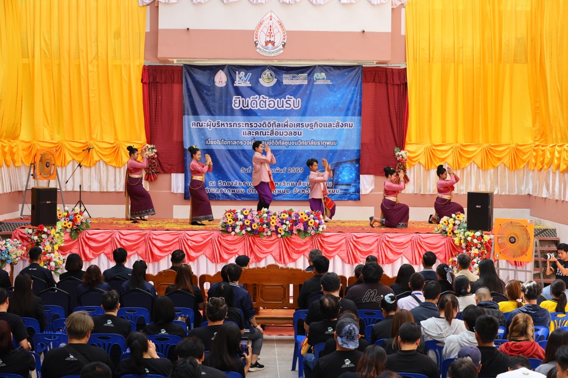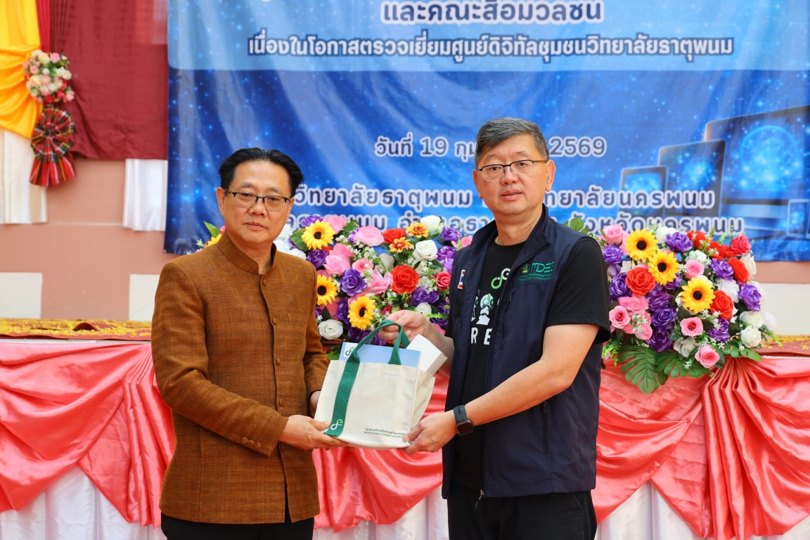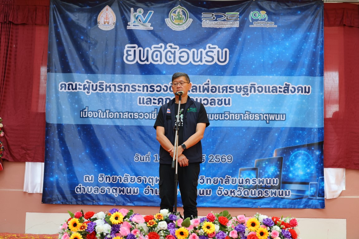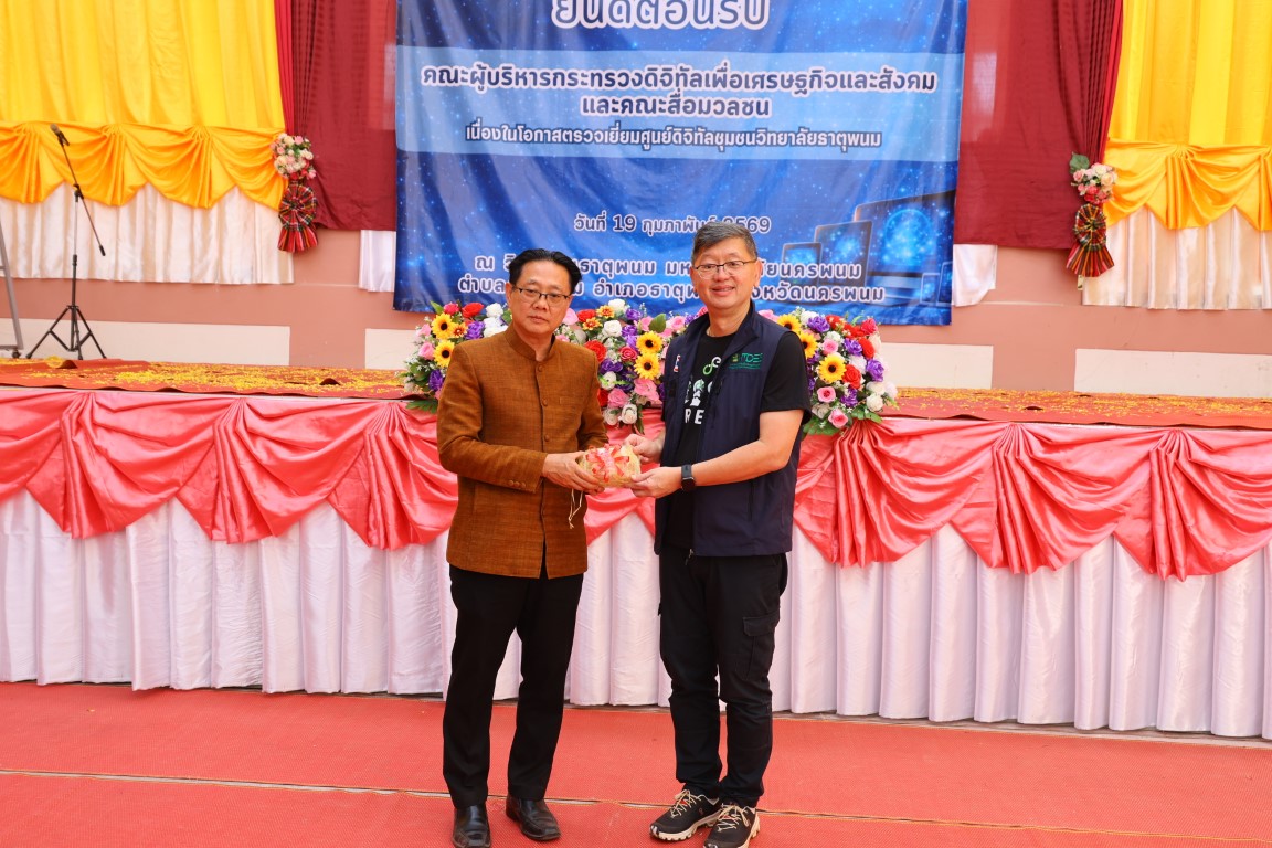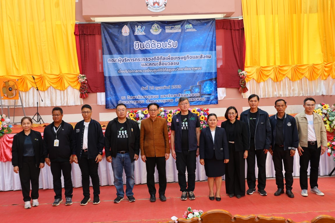 วันที่ 19 กุมภาพันธ์ 2569 เวลา 14.00 น. ศาสตราจารย์เกียรติคุณ ดร.ธวัชชัย ศุภดิษฐ์ อธิการบดีมหาวิทยาลัยนครพนม พร้อมด้วย ผู้ช่วยศาสตราจารย์จุฑามาศ ใจสบาย ผู้อำนวยการวิทยาลัยธาตุพนม คณาจารย์และบุคลากร วิทยาลัยธาตุพนม ม.นครพนม ร่วมเป็นเกียรติและให้การต้อนรับ นายพชร อนันตศิลป์ ปลัดกระทรวงดิจิทัลเพื่อเศรษฐกิจและสังคมและคณะะผู้บริหารฯในโอกาสลงพื้นที่ตรวจราชการ ณ ศูนย์ดิจิทัลชุมชนวิทยาลัยธาตุพนม มหาวิทยาลัยนครพนม อำเภอธาตุพนม จังหวัดนครพนม