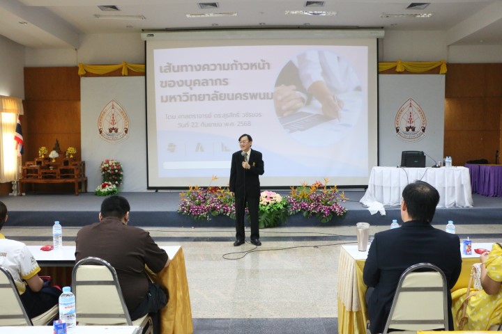 วันที่ 22 กันยายน 2568 เวลา 09.00 น. มหาวิทยาลัยนครพนม จัดโครงการกิจกรรมปฐมนิเทศบุคลากรใหม่ โดยมี ศาสตราจารย์เกียรติคุณ ดร.ธวัชชัย ศุภดิษฐ์ อธิการบดีมหาวิทยาลัยนครพนม เป็นประธานในพิธี พร้อมกล่าวเปิดโครงการ และให้เกียรติบรรยายพิเศษในหัวข้อ “นโยบายและทิศทางการบริหารสถาบันอุดมศึกษาในอนาคต” พร้อมด้วย ศาสตราจารย์ ดร.สุรสิทธิ์ วชิรขจร รองอธิการบดีฝ่ายบริหารทรัพยากรมนุษย์ เข้าร่วมกิจกรรมร่วมกับบุคลากรใหม่ ณ ห้องพนมนาคา ชั้น 5 สำนักงานอธิการบดี มหาวิทยาลัยนครพนม เขตพื้นที่ศรีโคตรบูรณ์