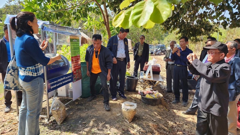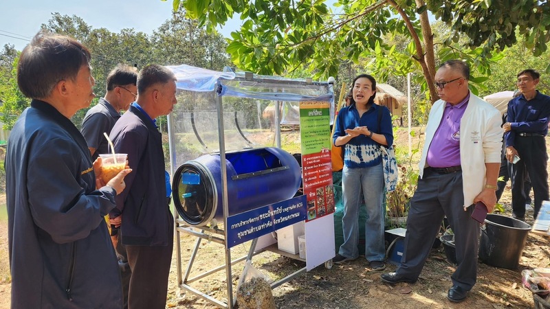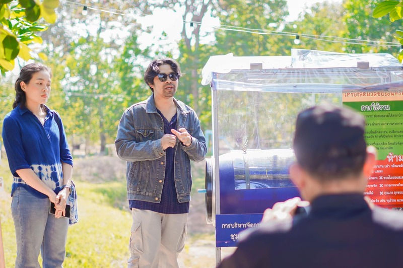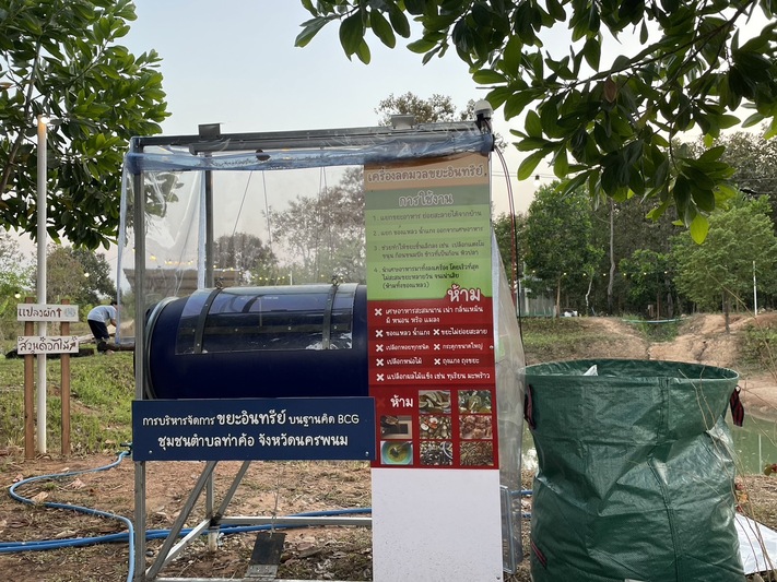 ที่บริเวณแหล่งเรียนรู้โคกหนองนาโมเดล Journey Garden & Camping บ.หนองบัวใต้ ต.หนองญาติ อ.เมือง จ.นครพนม ผู้ช่วยศาสตราจารย์ ดร.วรมิญช์ พันธุรัตน์ อาจารย์ประจำสาขาวิศวกรรมโยธา คณะวิศวกรรมศาสตร์ มหาวิทยาลัยนครพนม พร้อมผู้ช่วยนักวิจัย สาธิตและวิธีการใช้งาน “เครื่องลดมวลขยะอินทรีย์” ให้กับผู้ที่มาศึกษาดูงาน ซึ่งเป็นหนึ่งในฐานการเรียนรู้ลดคาร์บอน “โครงการการบริหารจัดการขยะอินทรีย์บนฐานคิด BCG ชุมชนตำบลท่าค้อ จังหวัดนครพนม”