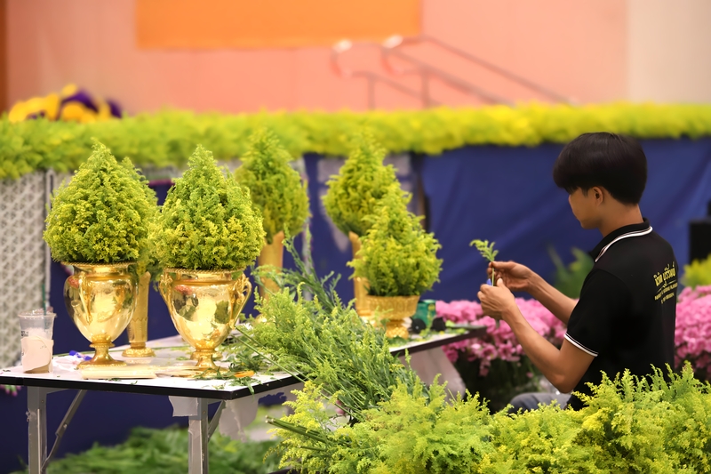 แน่นอนว่าทั้งพื้นที่อาคารต่าง ๆ จะถูกตกแต่งด้วยไม้ดอกไม้ประดับอย่างสวยงาม แม้กระทั่งพระแท่นที่ประทับพระราชทานปริญญาบัตรก็ถูกประดับตกแต่งให้เกิดความสวยงามด้วยดอกไม้สดเพียงชั่วข้ามคืน จากการวางแผนของทีมงานช่างตกแต่งเวที (ออแกไนซ์)