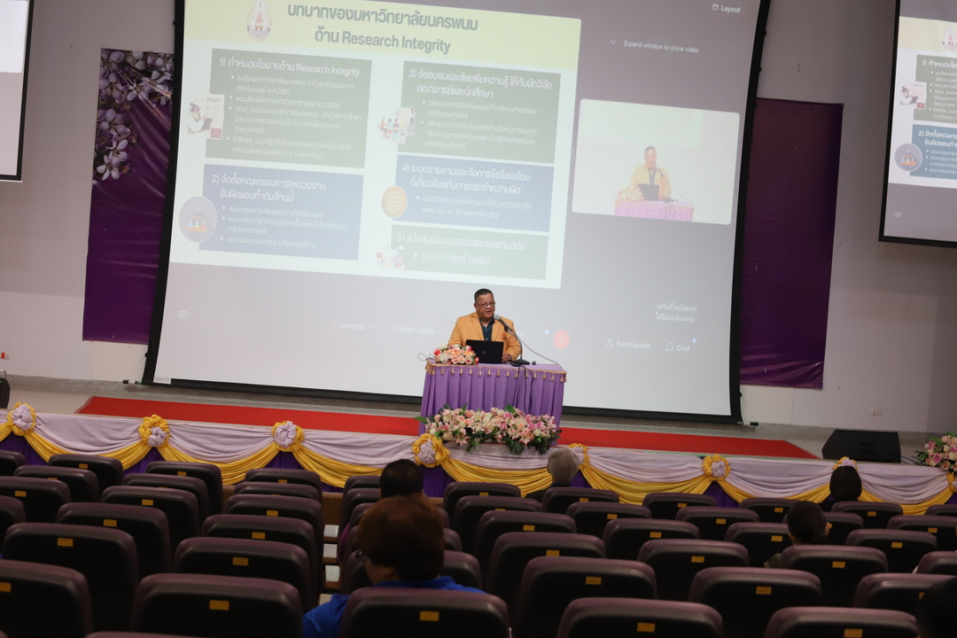 ภายในงานประกอบด้วยกิจกรรมการบรรยายในหัวข้อเรื่อง “บทบาทและภารกิจด้าน Research Integrity ของสถาบัน” โดย รศ.ดร.กรไชย พรลภัสรชกร รองอธิการบดี ฝ่ายการคลัง วิจัยและบริการวิชาการ มหาวิทยาลัยนครพนม