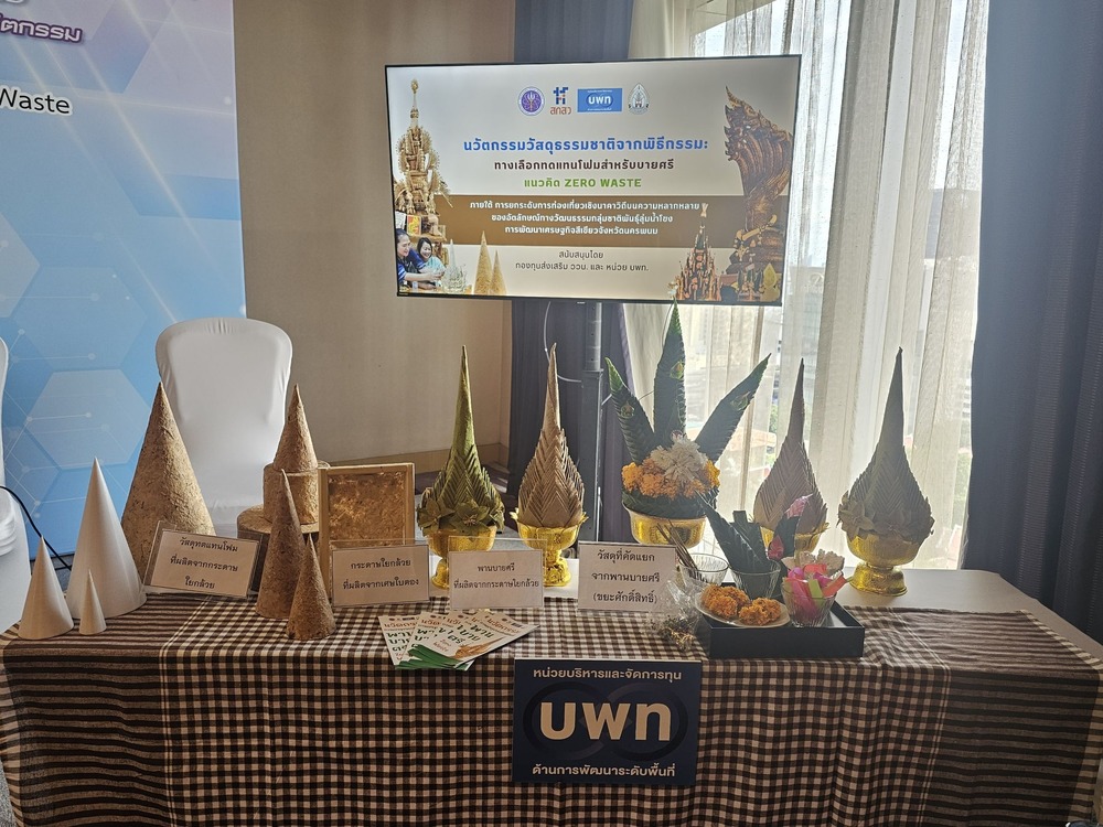 🔹 “นวัตกรรมวัสดุธรรมชาติจากพิธีกรรม: ทางเลือกทดแทนโฟมสำหรับพานบายศรี แนวคิด Zero Waste” ภายใต้โครงการยกระดับการท่องเที่ยวเชิงนาคาวิถี โดยคณะนักวิจัย ได้แก่