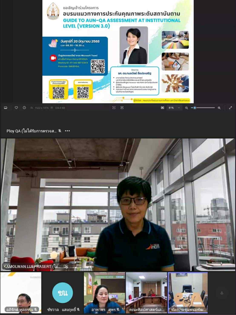 วันศุกร์ที่ 20 มิถุนายน 2568 เวลา 08.30 – 16.30 น. แผนกประกันคุณภาพการศึกษา กองนโยบายแผน ได้จัดโครงการอบรมแนวทางการประกันคุณภาพระดับสถาบันตาม “Guide to AUN-QA Assessment at Institutional Level (Version 3.0) ขึ้นในรูปแบบออนไลน์ ผ่านระบบ Zoom Meeting โดยมีวัตถุประสงค์เพื่อเสริมสร้างความรู้ความเข้าใจเกี่ยวกับเกณฑ์การประเมินคุณภาพระดับสถาบันตามแนวทางของเครือข่ายมหาวิทยาลัยอาเซียน (AUN-QA) และเพื่อเตรียมความพร้อมแก่ผู้บริหาร คณาจารย์ และบุคลากรในการยกระดับระบบการประกันคุณภาพการศึกษาของสถาบันให้สอดคล้องกับมาตรฐานสากล