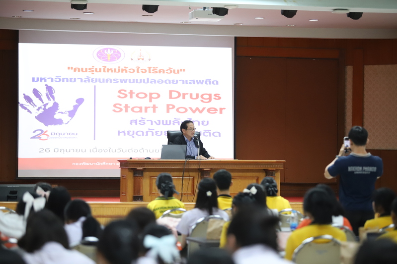 วันที่ 7 สิงหาคม 2568 เวลา 09.00 น. กองพัฒนานักศึกษา มหาวิทยาลัยนครพนม จัดโครงการ TO BE NUMBER ONE รณรงค์วันต้านภัยยาเสพติดโลก ภายใต้แนวคิด "สร้างภูมิคุ้มกันและป้องกันยาเสพติดในสถาบันอุดมศึกษา" โดยมีเป้าหมายเสริมสร้างความรู้ให้แก่ผู้นำนักศึกษาและบุคลากร เพื่อขับเคลื่อนมหาวิทยาลัยปลอดยาเสพติดตามกฎหมาย ประจำปีการศึกษา 2568 โดยมี ศาสตราจารย์เกียรติคุณ ดร.ธวัชชัย ศุภดิษฐ์ อธิการบดีมหาวิทยาลัยนครพนม เป็นประธานเปิดงาน มีนักศึกษา บุคลากร เจ้าหน้าที่ และหน่วยงานภาคีเครือข่ายเข้าร่วม ณ ห้องพนมศิลป์ ชั้น M คณะศิลปศาสตร์และวิทยาศาสตร์ มหาวิทยาลัยนครพนม (เขตพื้นที่มรุกขนคร)