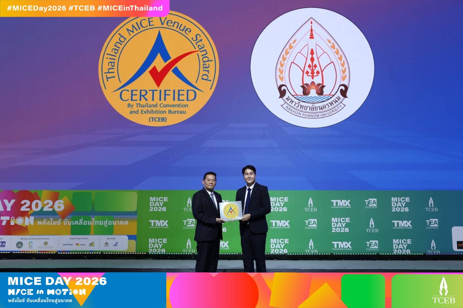 วันที่ 29 เมษายน 2569 ศาสตราจารย์เกียรติคุณ ดร.ธวัชชัย ศุภดิษฐ์ อธิการบดีมหาวิทยาลัยนครพนม ได้มอบหมายให้ ดร.กันตภพ บัวทอง ผู้ช่วยอธิการบดีฝ่ายสื่อสารองค์กรและวิเทศสัมพันธ์ เป็นผู้แทนมหาวิทยาลัยเข้าร่วมพิธีรับมอบตราสัญลักษณ์มาตรฐานสถานที่จัดงานประเทศไทย (Thailand MICE Venue Standard: TMVS) ประเภทห้องประชุม จากสำนักงานส่งเสริมการจัดประชุมและนิทรรศการ (องค์การมหาชน) หรือ TCEB (Thailand Convention & Exhibition Bureau) โดยมีนายนภินทร ศรีสรรพางค์ รัฐมนตรีประจำสำนักนายกรัฐมนตรี เป็นประธานในพิธี ภายในงาน MICE Standards Day 2026 ณ ห้อง Ballroom 4 ศูนย์การประชุมแห่งชาติสิริกิติ์ กรุงเทพมหานคร