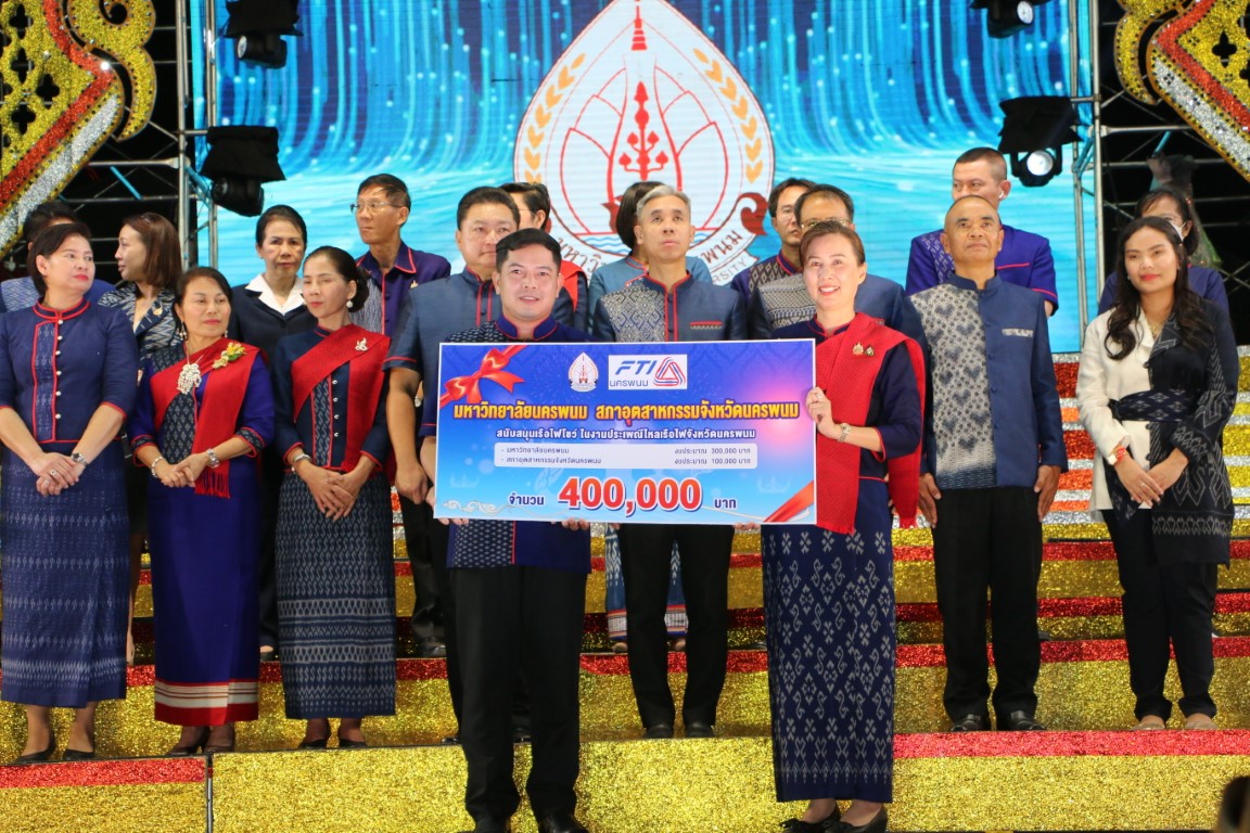 วันที่ 8 ตุลาคม 2567 เวลา 19.00 น. ผู้ช่วยศาสตราจารย์ ดร.เกรียงไกร ผาสุตะ ผู้ช่วยอธิการบดีฝ่ายกิจการนักศึกษาและศิลปวัฒนธรรม ร่วมพิธีเปิดงานประเพณีไหลเรือไฟนครพนม ประจำปี 2567 พร้อมรับมอบโล่และใบประกาศเกียรติคุณในโอกาสที่มหาวิทยาลัยนครพนมร่วมกับสภาอุตสาหกรรมจังหวัดนครพนม สนับสนุนสร้างเรือไฟโชว์ภายในงานประเพณีไหลเรือไฟนครพนม ประจำปี 2567 จำนวน 400,000 บาท โดยมีนางรณิดา เหลืองฐิติสกุล รองผู้ว่าราชการจังหวัดนครพนม รักษาราชการแทนผู้ว่าราชการจังหวัดนครพนม เป็นประธานมอบรางวัล ณ เวทีกลาง บริเวณศาลากลางจังหวัดนครพนม