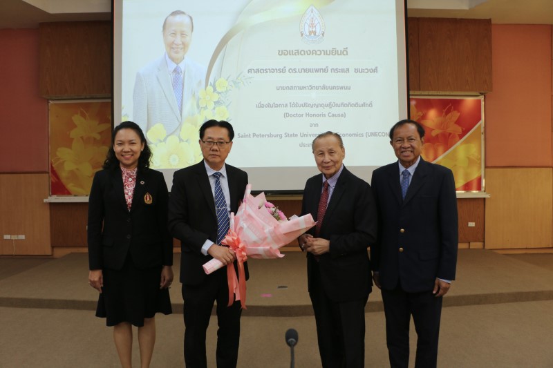 ในโอกาสเดียวกันนี้ ศาสตราจารย์เกียรติคุณ ดร.ธวัชชัย ศุภดิษฐ์ อธิการบดีมหาวิทยาลัยนครพนม ในนามตัวแทนคณะกรรมการสภามหาวิทยาลัย ได้มอบช่อดอกไม้แสดงความยินดีแก่ ศาสตราจารย์ ดร.นายแพทย์กระแส ชนะวงศ์ เนื่องในโอกาสได้รับปริญญาดุษฏีบัณฑิตกิตติมศักดิ์ (Doctor Honoris Causa) จาก Sain Petersburg State University of Economics (UNECON) ประเทศสหพันธรัฐรัสเซีย