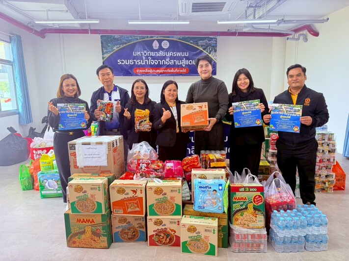 มหาวิทยาลัยนครพนมได้เปิดศูนย์รับบริจาคภายใต้ชื่อ “มหาวิทยาลัยนครพนม รวมธารน้ำใจจากอีสานสู่แดนใต้” ตั้งแต่วันที่ 25–28 พฤศจิกายน 2568 ซึ่งวันนี้เป็นวันสุดท้ายของการเปิดรับบริจาค โดยยังคงมีประชาชนและชาวมหาวิทยาลัยหลั่งไหลนำสิ่งของมามอบให้เป็นจำนวนมาก สะท้อนให้เห็นถึงพลังน้ำใจและความห่วงใยที่ชาวนครพนมมีต่อผู้ประสบภัย