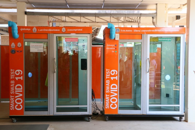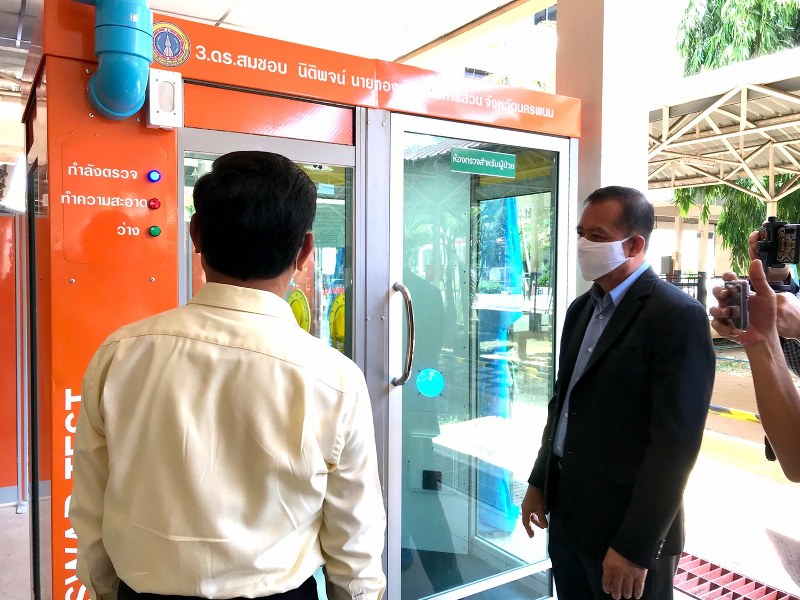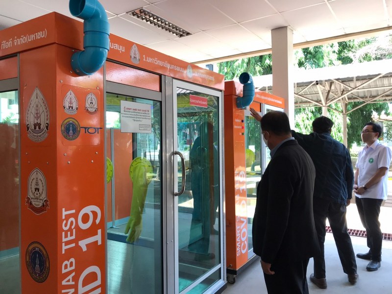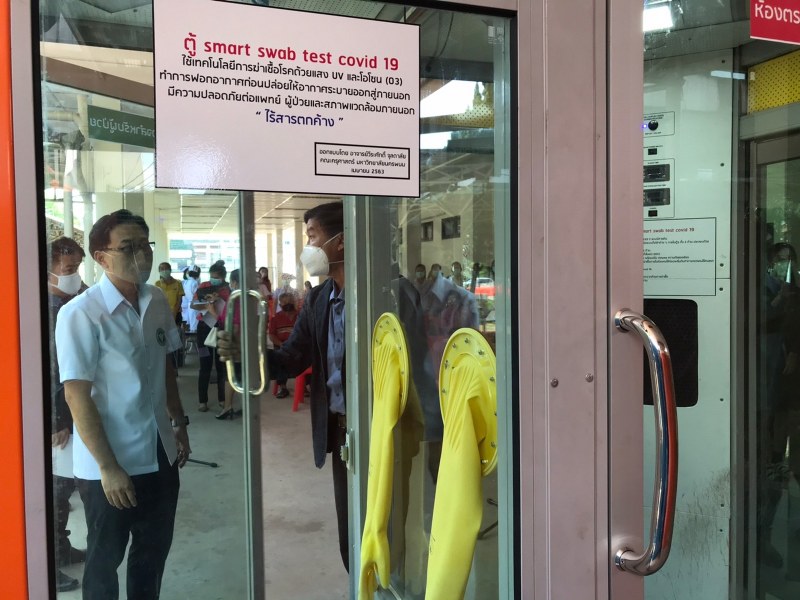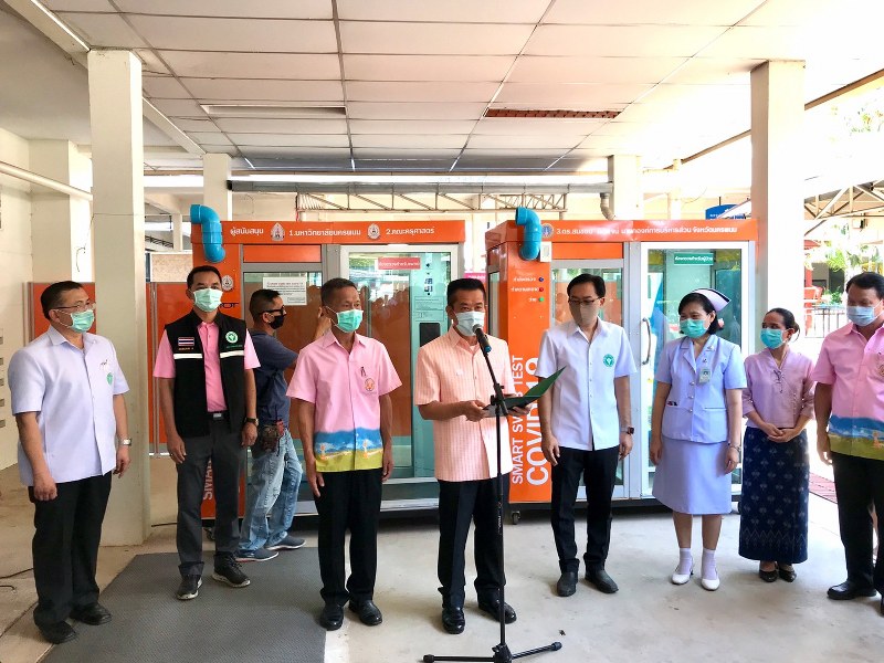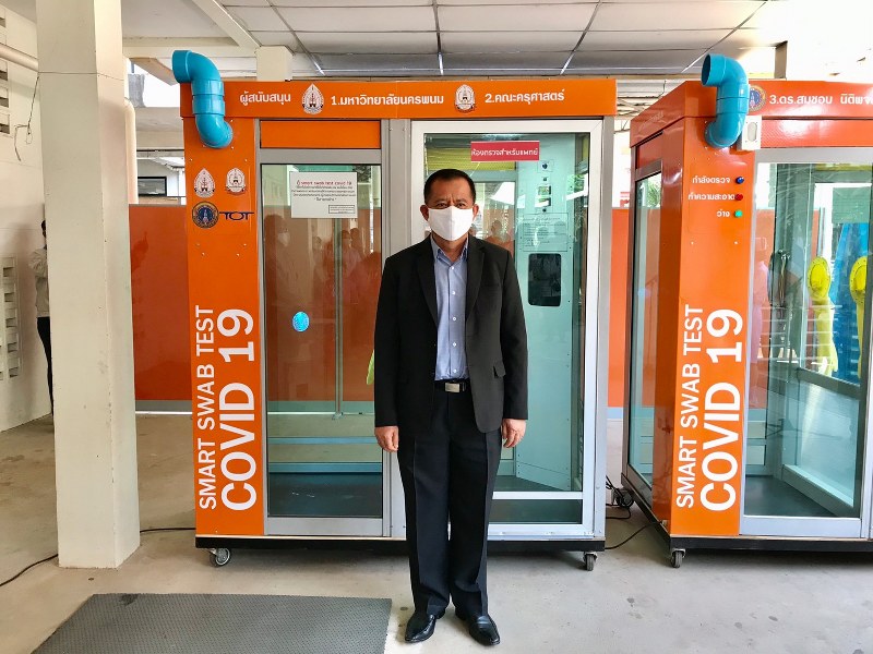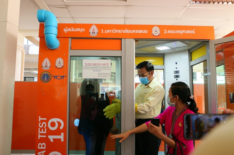 อาจารย์วีระศักดิ์ จุลดาลัย อาจารย์ประจำสาขาวิชาวิทยาศาสตร์ คณะครุศาสตร์ มหาวิทยาลัยนครพนม ผู้คิดค้นนวัตกรรมตู้ตรวจคัดกรองเชื้อไวรัสโคโรนา 2019 (Smart Swab Test Covid 19) เปิดเผยว่า ตนได้ทำการวิจัยเกี่ยวกับประโยชน์ของก๊าซโอโซนมาใช้ในการอบฆ่าเชื้อไวรัส แบคทีเรีย ไรฝุ่นและเชื้อรา เพื่อทำลายเชื้อโรคในพื้นที่ทำงาน และรถยนต์ส่วนบุคคลมาตลอดระยะเวลาที่เกิดเหตุการณ์การแพร่ระบาดของเชื้อไวรัสโคโรนา 2019 ต่อมาเมื่อทราบปัญหาการตรวจคัดกรองผู้ป่วยของโรงพยาบาลนครพนม ที่สุ่มเสี่ยงต่อการติดเชื้อจากผู้ป่วยสู่บุคลากรทางการแพทย์ จึงได้หารือกับหน่วยงานทืี่เกี่ยวข้องจนได้รับการสนับสนุนงบประมาณในการออกแบบและผลิตตู้ตรวจคัดกรองเชื้อไวรัสโควิด-19 (Smart Swab Test Covid 19) จาก ดร.สมชอบ นิติพจน์ นายกองค์การบริหารส่วนจังหวัดนครพนม โดยขอใช้ตู้โทรศัพท์เก่าของ บริษัท ทีโอที จำกัด(มหาชน) มาเป็นโครงสร้างตู้ ซึ่งหลักการทำงานของตู้ตรวจคัดกรองเชื้อนี้ จะประกอบด้วยตู้สำหรับแพทย์และตู้สำหรับผู้ป่วย ที่จะส่งผลให้แพทย์และผู้ป่วยไม่ต้องสัมผัสกัน พร้อมทั้งระบบการทำความสะอาดฆ่าเชื้อด้วยแสงอัลตราไวโอเลต UV (Ultraviolet) ประเภท UVC ที่มีความยาวคลื่นสั้นที่สุด (200-280 nm) ที่มีพลังงานสูงสุดและมีประสิทธิภาพในการฆ่าเชื้อมากที่สุด