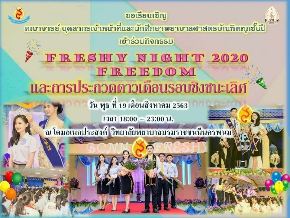 วันที่ 19 สิงหาคม 2563 ฝ่ายส่งเสริมและพัฒนานักศึกษา วิทยาลัยพยาบาลบรมราชชนนีนครพนม มหาวิทยาลัยนครพนมได้จัดกิจกรรมประกวดดาวเดือน Freshy boy and girl 2020 ณ โดมสนามกีฬาวิทยาลัยพยาบาลฯ การจัดงานในครั้งนี้ได้รับเกียรติจาก ดร.บุญรอด ดอนประเพ็ง คณบดีวิทยาลัยพยาบาลบรมราชชนนีนครพนม เป็นประธานกล่าวเปิดโครงการ การจัดโครงการโดยมีวัตถุประสงค์เพื่อให้นักศึกษาได้แลกเปลี่ยนเรียนรู้ระหว่างชั้นปี สร้างการมีส่วนร่วมในการสร้างกิจกรรมที่สร้างสรรค์ของนักศึกษารุ่นพี่ในวิทยาลัย คัดเลือกตัวแทนนักศึกษาที่ความรู้ ความสามารถ มีบุคลิกภาพดี กล้าแสดงออกการประกวดในครั้งนี้ผู้ได้รับรางวัล ดาว/เดือน ได้แก่