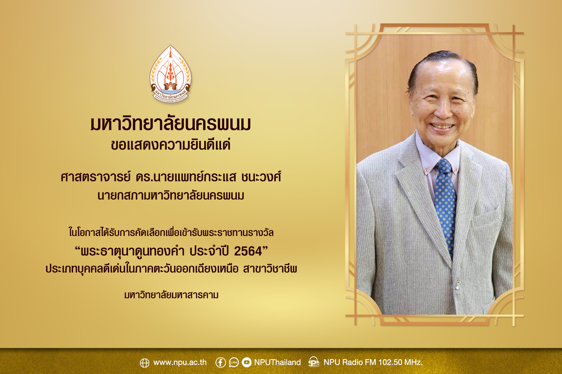 มหาวิทยาลัยนครพนม ขอแสดงความยินดีแด่ ศาสตราจารย์ ดร.นายแพทย์กระแส ชนะวงศ์ นายกสภามหาวิทยาลัยนครพนม ในโอกาสได้รับการคัดเลือกเพื่อเข้าพระราชทานรางวัล “พระธาตุนาดูนทองคำ” มหาวิทยาลัยมหาสารคาม ประจำปี พ.ศ.2564 ประเภทบุคคลดีเด่นในภาคตะวันออกเฉียงเหนือ สาขาวิชาชีพ ในวันพระราชทานปริญญาบัตร ประจำปี 2563