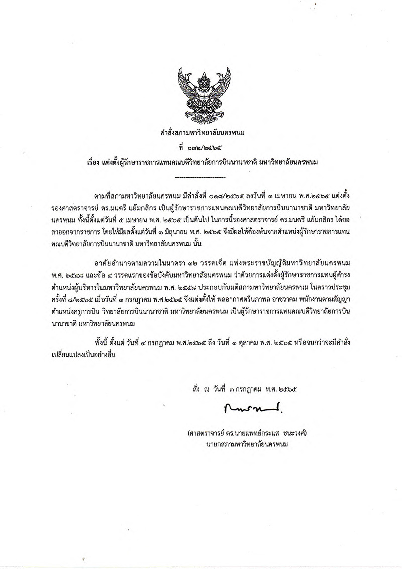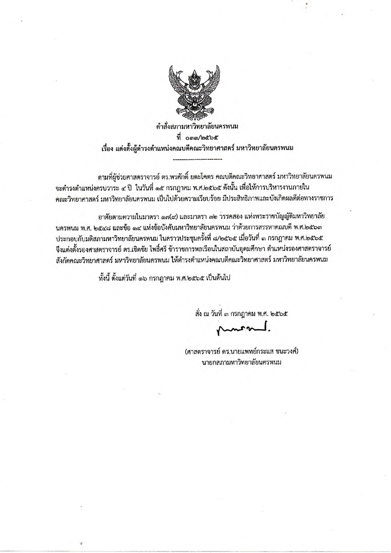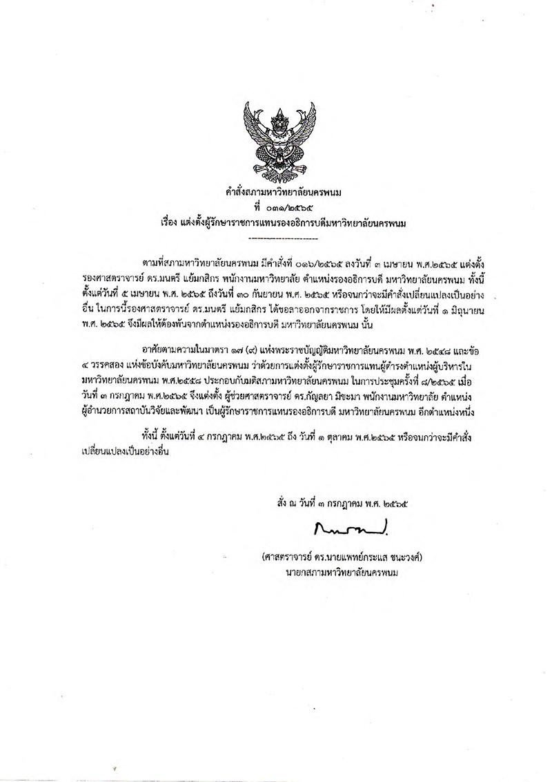 มหาวิทยาลัยนครพนม ตามคำสั่งสภามหาวิทยาลัยนครพนมที่ 031/2565 ตั้งแต่วันที่ 4