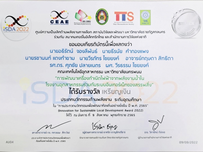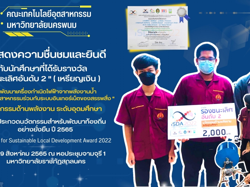 นักศึกษาคณะเทคโนโลยีอุตสาหกรรม คว้ารางวัลชนะเลิศอันดับ 2 (เหรียญเงิน) การประกวดนวัตกรรมสำหรับพัฒนาท้องถิ่นอย่างยั่งยืน ปี 2565