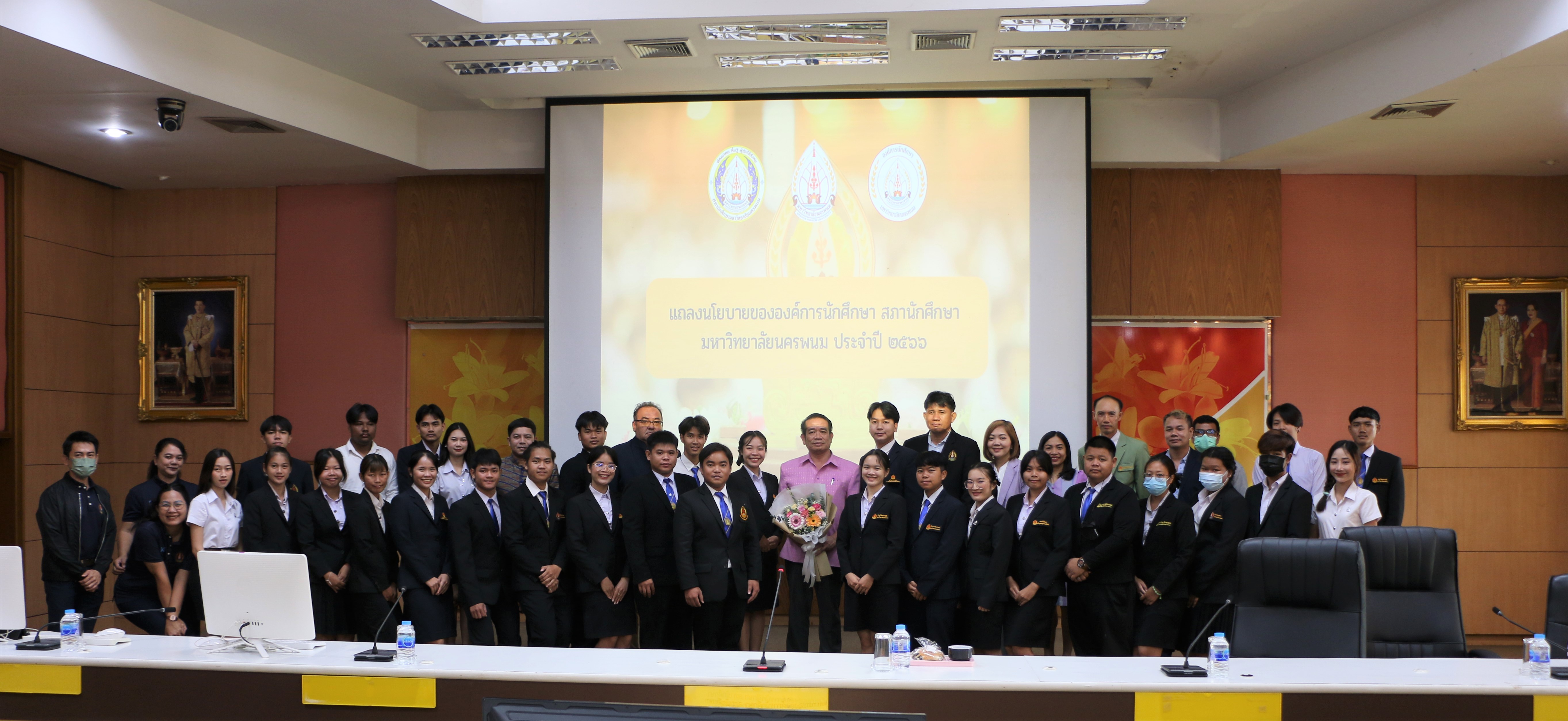 วันที่ 26 กรกฏาคม 2566 เวลา 09.00 น. ณ ห้องพนนมเมธี ชั้น 5 อาคารสารสนเทศเพื่อการบริหาร สำนักงานอธิการบดี มหาวิทยานครพนม จัดประชุมแถลงนโยบายองค์การนักศึกษา สภานักศึกษา ประจำปีการศึกษา 2566 โดยมี นายสมยศ สีแสนซุย รักษาราชการแทนอธิการบดี มหาวิทยาลัยนครพนมเป็นประธานในการประชุม พร้อมด้วยผู้ช่วยศาสตราจารย์ ดร.เกรียงไกร ผาสุตะ ผู้ช่วยอธิการฝ่ายพัฒนานักศึกษาและทำนุบำรุงศิลปวัฒนธรรม ผู้อำนวยการกองพัฒนานักศึกษา อาจารย์ที่ปรึกษาเจ้าหน้าที่ที่เกี่ยวข้อง และคณะกรรมการองค์การนักศึกษา สภานักศึกษา เพื่อแถลงการกำหนดทิศทางการบริหารงานขององค์การนักศึกษา สภานักศึกษา ประจำปีการศึกษา2566 และการกำกับดูแลตรวจสอบกิจกรรมต่างๆ ให้เป็นไปตามวัตถุประสงค์และนโยบายของมหาวิทยาลัยนครพนม ให้เกิดประโยชน์สูงสุดแก่นักศึกษา