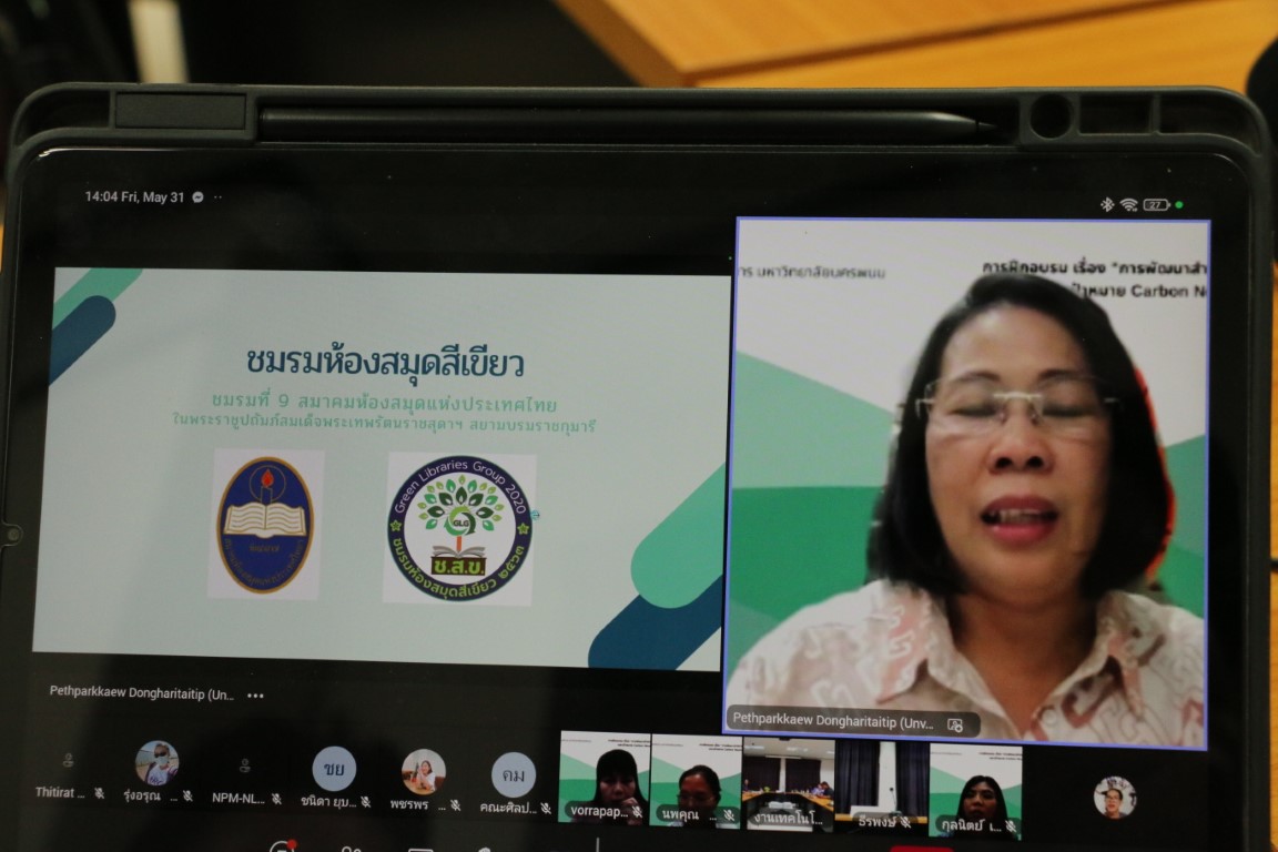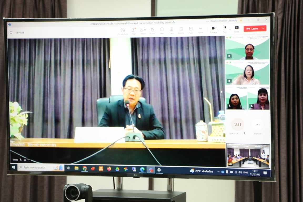 วันที่ 31 พฤษภาคม 2567 เวลา 13.30 น. สำนักวิทยบริการ มหาวิทยาลัยนครพนม จัดโครงการฝึกอบรม “การพัฒนาสำนักวิทยบริการสู่ห้องสมุดสีเขียว และเป้าหมาย Carbon Neutrality อย่างยั่งยืน” โดยมี ศาสตราจารย์ ดร.ธวัชชัย ศุภดิษฐ์ รักษาราชการแทนอธิการบดีมหาวิทยาลัยนครพนม เป็นประธานกล่าวเปิดงาน มีนางรุ่งเรือง สงเคราะห์ ผู้อำนวยการสำนักวิทยบริการ กล่าวรายงาน พร้อมผู้บริหารบุคลากรเจ้าหน้าทีนักศึกษา เข้าร่วมโครงการฝึกอบรมฯ และได้รับเกียรติจาก นางสาวเพชรประกายแก้ว ดวงหฤทัยทิพย์ ผู้อำนวยการกองบริหารงาน สำนักหอสมุด มหาวิทยาลัยแม่โจ้ ในการบรรยายพิเศษ เรื่อง มหาวิทยาลัยนครพนมกับเป้าหมายการเป็นมหาวิทยาลัยสีเขียว Carbon Neutrality เป็นวิทยากรบรรยายให้ความรู้ในครั้งนี้ ในรูปแบบออนไลน์ผ่านโปรแกรม Microsoft Teams ณ ห้องประชุม ชั้น 4 สำนักงานวิทยบริการ มหาวิทยาลัยนครพนม เขตพื้นที่มรุกขนคร