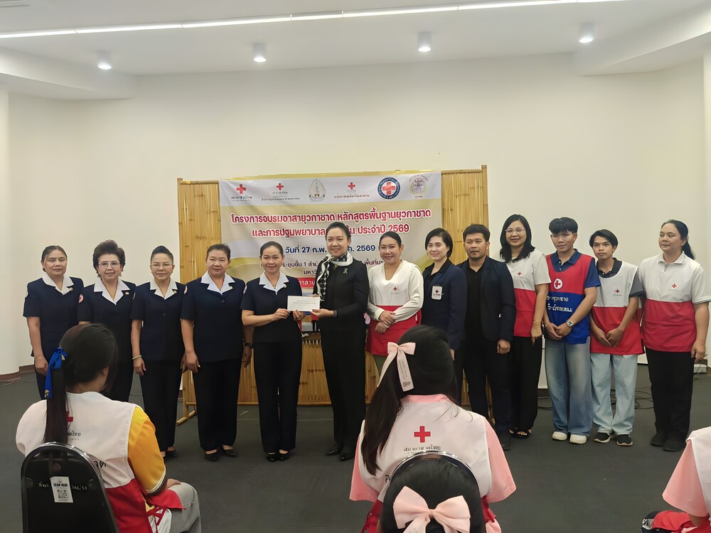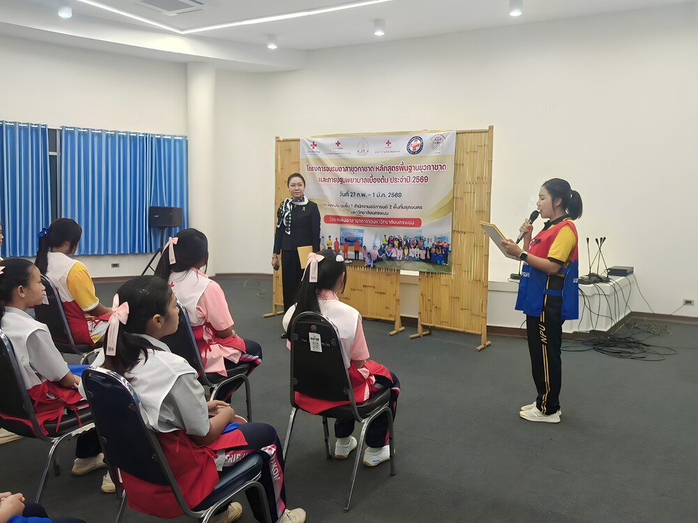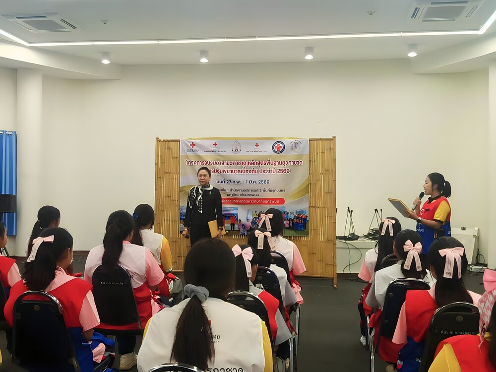 วันที่ 28 กุมภาพันธ์ 2569 เวลา 09.00 น. ผู้ช่วยศาสตราจารย์ ดร.รุ้งลาวัลย์ เอี่ยมกุศลกิจ รองอธิการบดีฝ่ายกิจการพิเศษและประกันคุณภาพการศึกษา มหาวิทยาลัยนครพนม เป็นประธานในพิธีเปิดโครงการอบรมอาสายุวกาชาด เรื่อง หลักสูตรพื้นฐานยุวกาชาด ประจำปี 2569 และโครงการอบรมอาสายุวกาชาด เรื่อง การปฐมพยาบาลเบื้องต้น พร้อมด้วย ดร.พรหมภัสสร ชุณหบุญญทิพย์ ผู้ช่วยอธิการบดีฝ่ายกิจการนักศึกษาและศิลปวัฒนธรรม รวมถึงบุคลากรกองพัฒนานักศึกษา สำนักงานอธิการบดี เข้าร่วมพิธี ณ ห้องประชุมชั้น 3 อาคารสำนักงานอธิการบดี 2 มหาวิทยาลัยนครพนม เขตพื้นที่มรุกขนคร