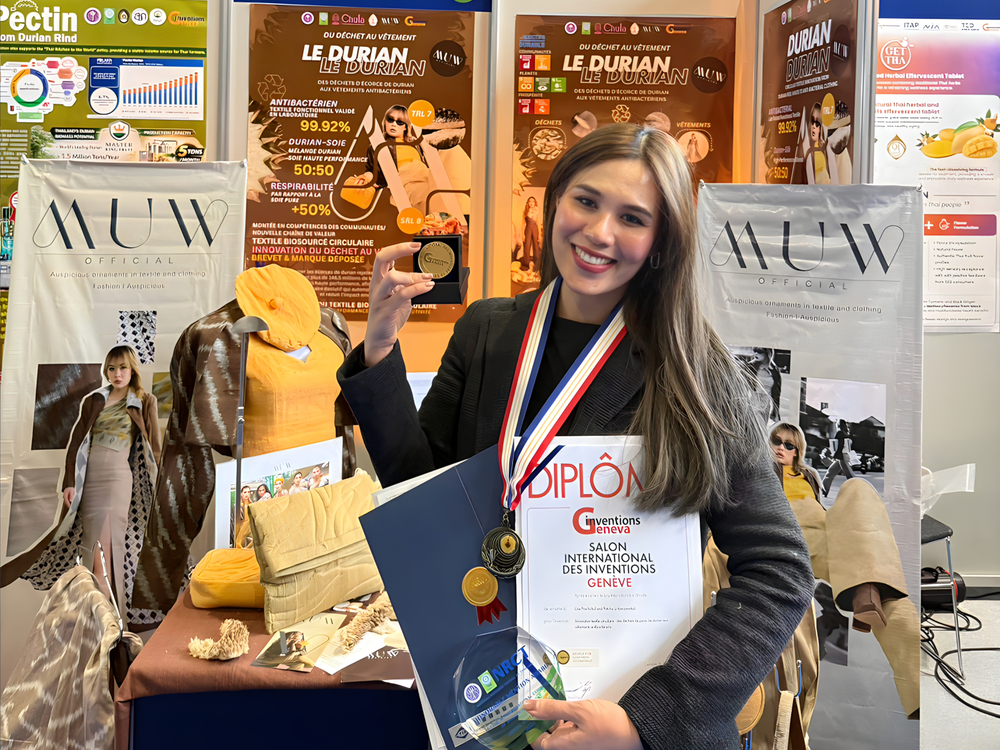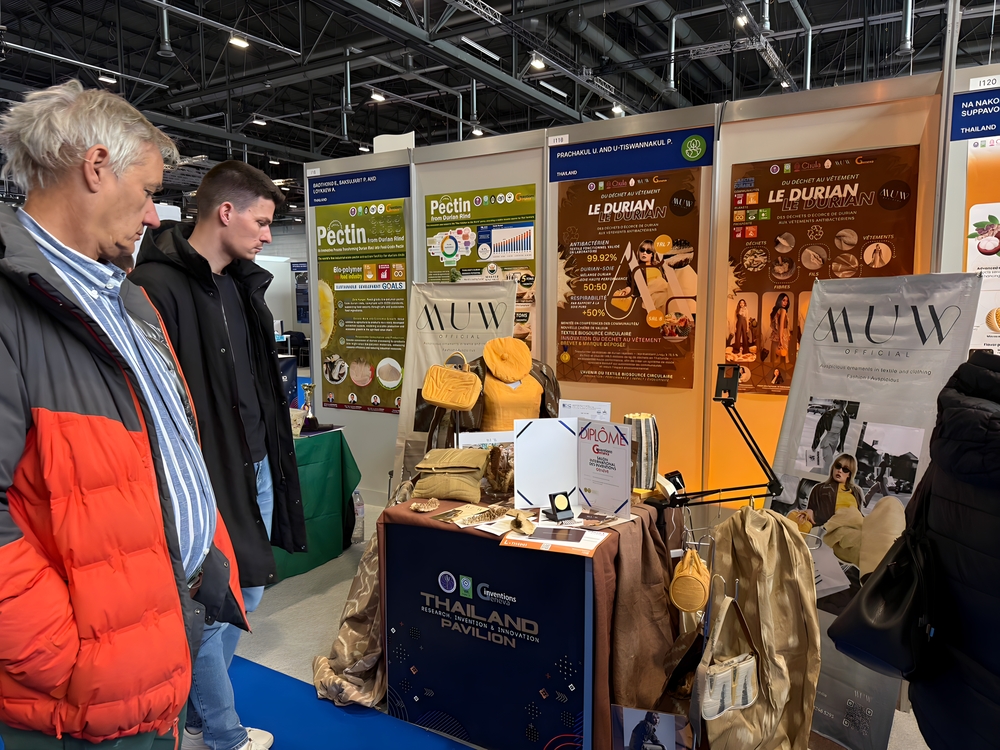 ในการนี้ ผลงาน “Innovation textile circulaire : des déchets de peau de durian aux vêtements antibactériens” ซึ่งเป็นนวัตกรรมสิ่งทอจากเศษเหลือทิ้งเปลือกทุเรียน สู่การพัฒนาเป็นเสื้อผ้าคุณสมบัติต้านแบคทีเรีย สามารถคว้า 3 รางวัลสำคัญ ได้แก่