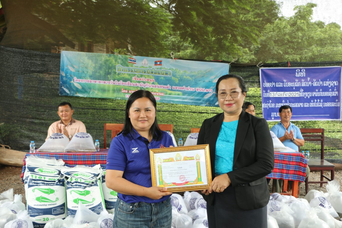 วันที่ 13 กรกฎาคม 2568 เวลา 09.00 น. ศาสตราจารย์เกียรติคุณ ดร.ธวัชชัย ศุภดิษฐ์ อธิการบดีมหาวิทยาลัยนครพนม พร้อมด้วยคณะผู้บริหารมหาวิทยาลัยนครพนม ผู้ช่วยศาสตราจารย์ ดร.เสาวคนธ์ เหมวงษ์ คณบดีคณะเกษตรและเทคโนโลยี คณาจารย์ และบุคลากร ร่วมกิจกรรมปล่อยปลาเนื่องใน วันปล่อยปลาแห่งชาติลาว ภายใต้โครงการเพิ่มศักยภาพการผลิตเกษตรแก่ศูนย์การเรียนรู้การเกษตรแนวเศรษฐกิจพอเพียง ณ โรงเรียนสามัญกินนอนชนเผ่า แขวงคำม่วน สาธารณรัฐประชาธิปไตยประชาชนลาว