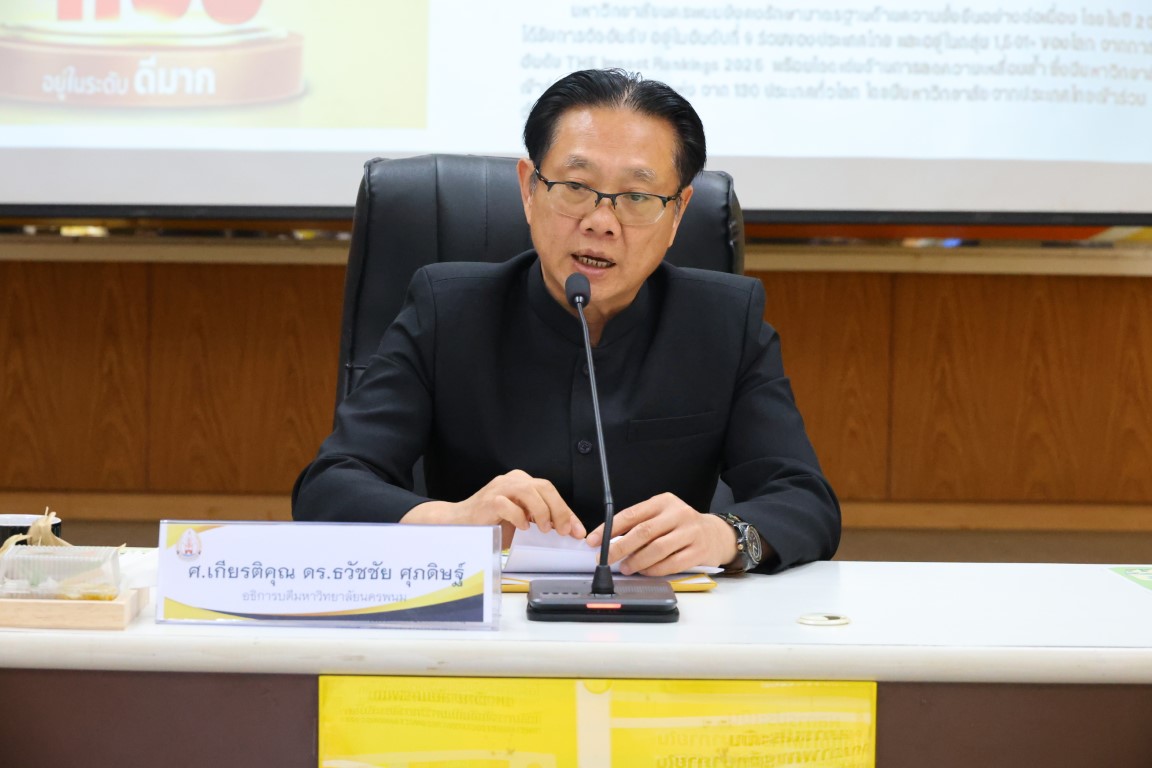 วันที่ 22 มกราคม 2569 เวลา 09.30 น. ศาสตราจารย์ ดร.ธวัชชัย ศุภดิษฐ์ อธิการบดีมหาวิทยาลัยนครพนม พร้อมด้วยคณะผู้บริหารและบุคลากรมหาวิทยาลัยนครพนม ร่วมให้การต้อนรับ นายกมล รอดคล้าย ประธานคณะกรรมาธิการการศึกษา การอุดมศึกษา วิทยาศาสตร์ วิจัยและนวัตกรรม วุฒิสภา พร้อมด้วยคณะกรรมาธิการ ในโอกาสเดินทางมาศึกษาดูงาน ณ ห้องพนมเมธี ชั้น 5 อาคารสำนักงานอธิการบดี 1 มหาวิทยาลัยนครพนม เขตพื้นที่ศรีโคตรบูรณ์